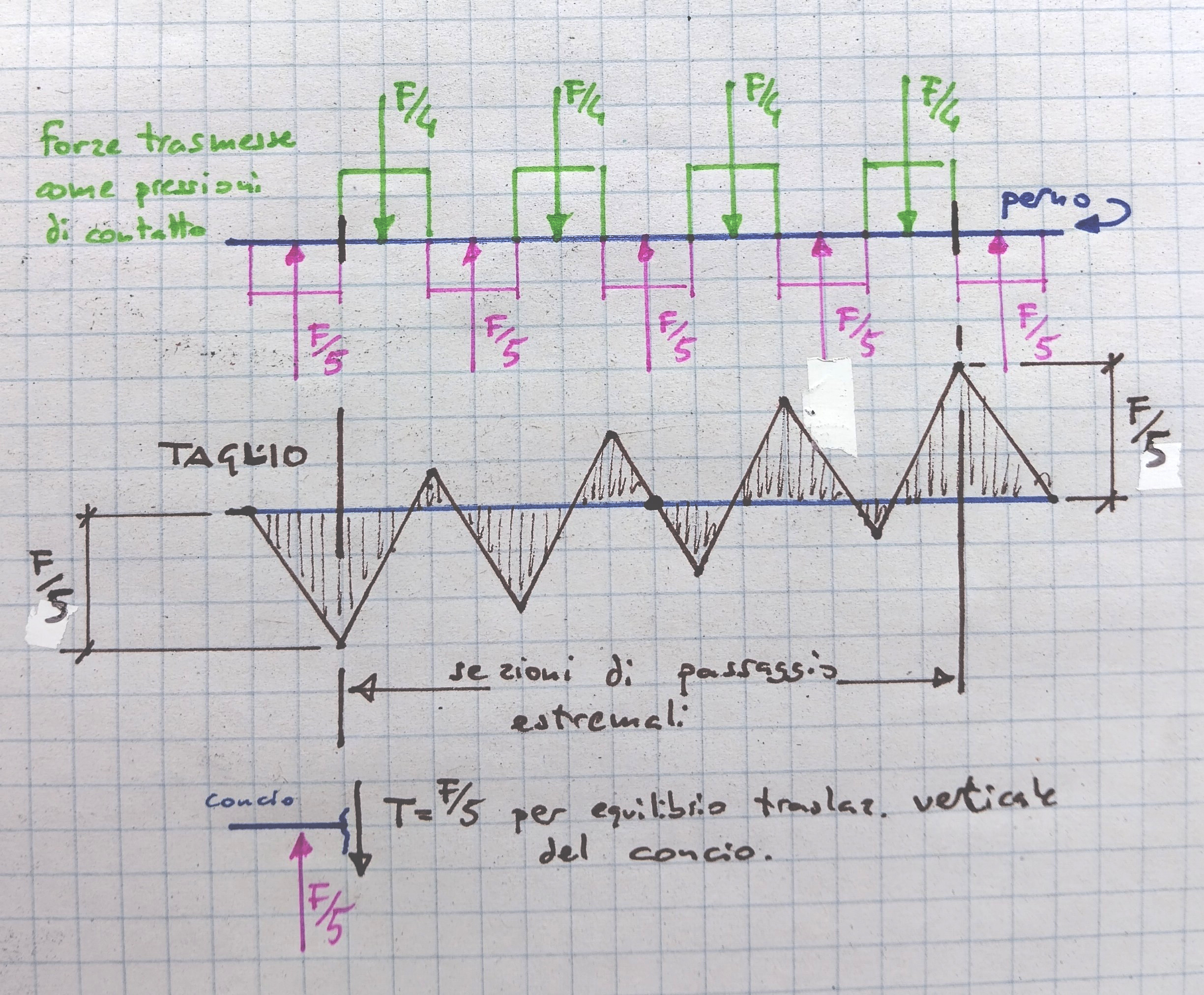 Con riferimento alla verifica del perno, questo risulta sollecitato da forze trasversali alternate verso il basso, di entità $F/4$, e verso l'alto, di entità $F/5$, che producono sullo stesso momento flettente e taglio. Quest'ultimo, in particolare, raggiunge un valore massimo di $F/5$ in corrispondenza dei passaggi di portata estremali, vedasi